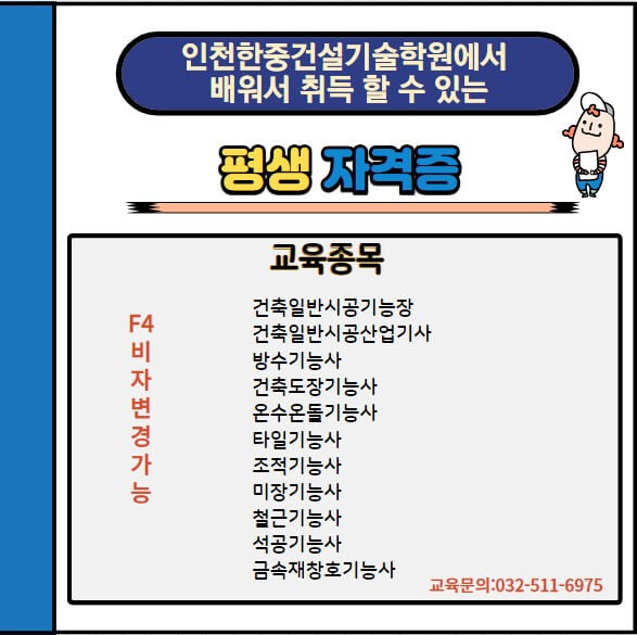 인천한중건설기술학원에서는 건축일반시공기능장 직강 유능한 원장님이 직접 교육을 진행하심에 높은 합격률을 이루고 있습니다.