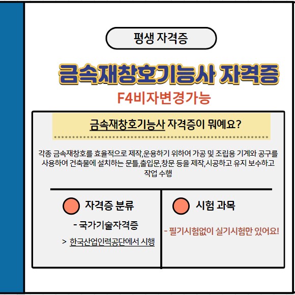 금속재창호의 사용이 증가하면서 건물의 사용목적, 전체공간의 동선계획, 실내 분위기, 디자인 양식, 실내 및 외부와의 연관성에 따라 창호의 사용재질, 크기, 형태, 위치, 개수를 결정하고 제작, 시공할 수 있는 숙련 기능공 양성이 필요하게 됩니다. 금속재창호기능사 자격증은 평생자격증일 뿐더러 동포분들이 따면은 F4비자변경도 가능합니다.