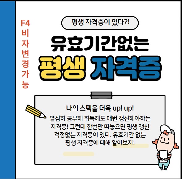 국가기술자격증으로 한번 따면 평생 유효한 자격증입니다. F4비자변경도 가능한 자격증입니다.