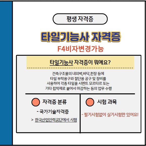 타일기능사 자격증을 취득하면 실제 건설현장에서 기능을 습득하여 타일공으로 취업하는 것이 일반적입니다. 작업의 특성상 일정한 회사에 상용직으로 고용된 않고 전문건설업체나 하도급자의 의뢰에 따라 작업을 수행합니다. 또한 동포분들을 자격증을 취득하면 F4비자변경 가능합니다.