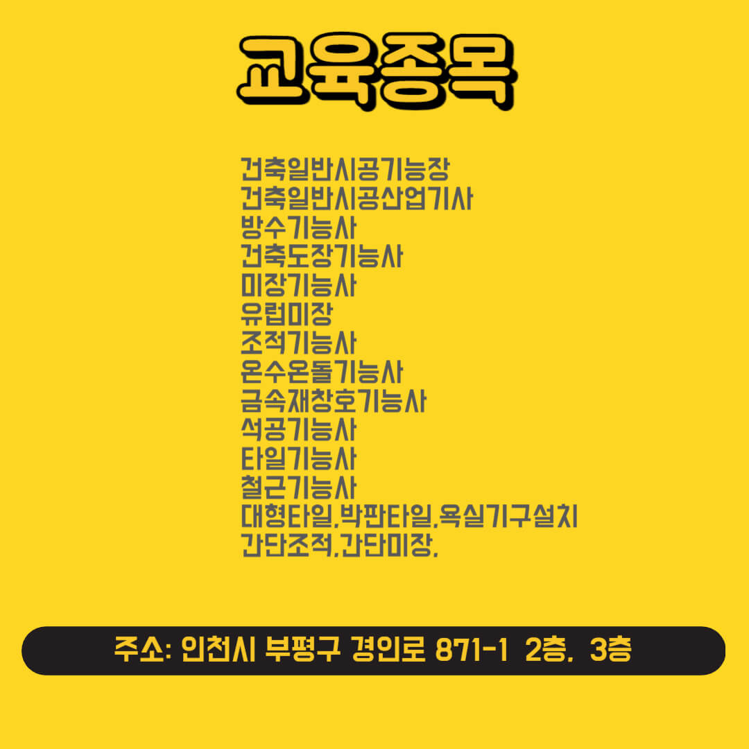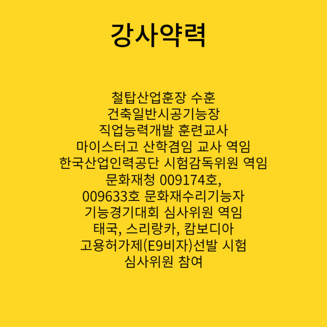 건축일반시공기능장 직강이시고, 한국산업인력공단 시험감독위원 역임, 경험이 많으신 유능한 원장님이 교육을 진행하심에 인천한중건설기술학원에서는 매년 높은 합격률을 이루고 있습니다.